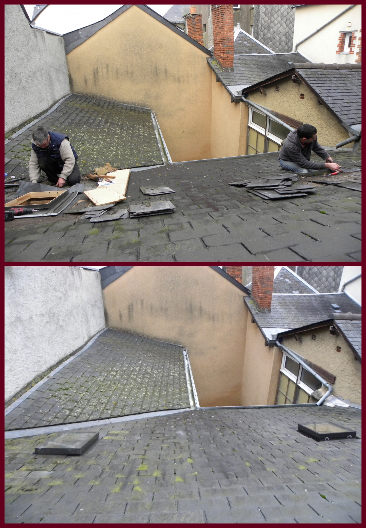 Papa a changé les 2 "velux" qui servent de puits de lumière dans le salon/cuisine T2 N°2. François l'a assisté, a déplacé des câbles électriques car il faut parfois penser pour les artisans. Moi j'ai bouiné : courses, popote (car oui nous nous arrêtons pour manger) et avec Loulou nous avons préparé les ouvertures du T2 N°2 : ponçage, nettoyage, scotchage.