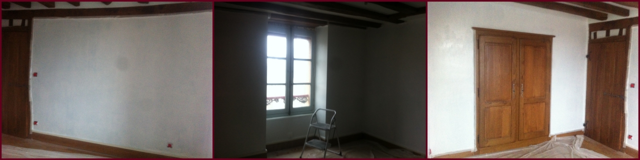 Dimanche donc, Loulou et moi nous sommes attelés à la peinture! Opération rebouchage, ponçage, protection des supports et peinture pour 3 pièces : la chambre et la salle de bain du T2 N°2 ainsi qu'une chambre du T3. Nous peignons tout en blanc avec de la peinture Glycéro satiné.