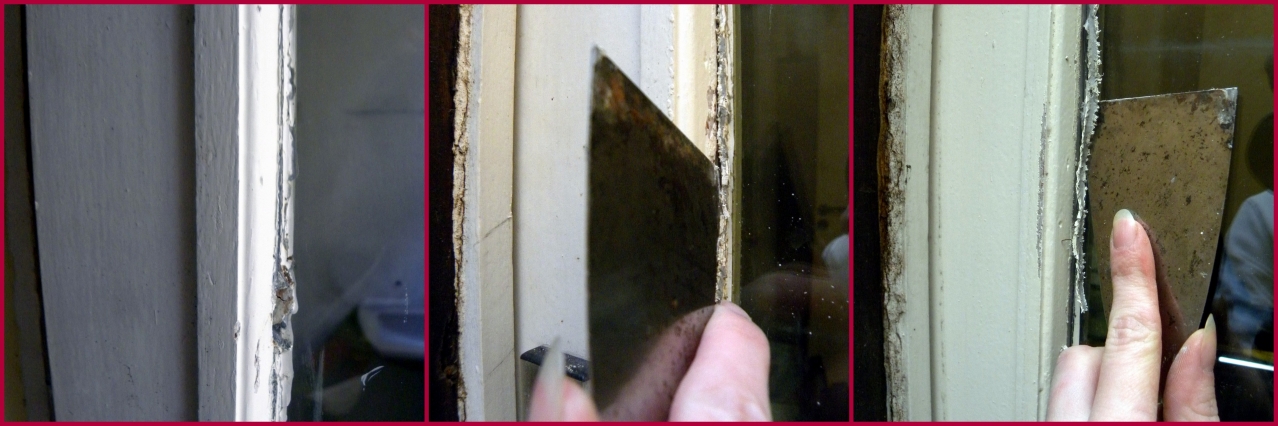Moi je décape mes petites fenêtres. J'enlève les joints qui débordent et sont tout BERK ainsi que la peinture que mes prédécesseurs ont barbouillé sur les vitres.
